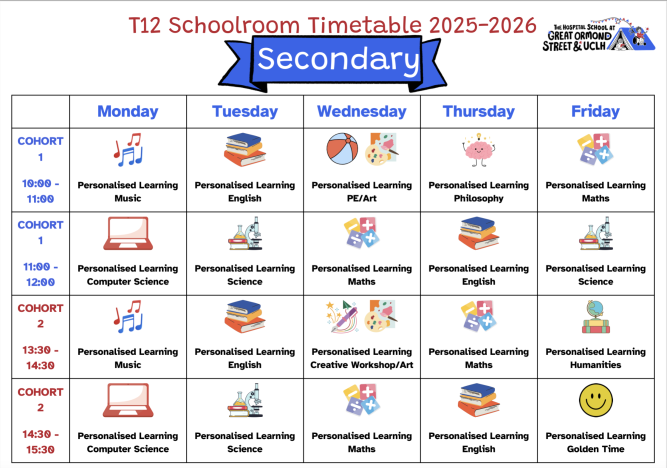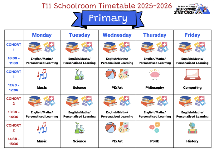 Timetables GOSH Primary Schoolroom TimetableGOSH Secondary Schoolroom TimetableUCLH Primary Schoolroom Timetable UCLH Secondary Schoolroom Timetable